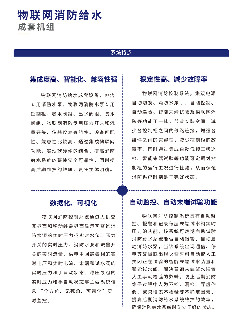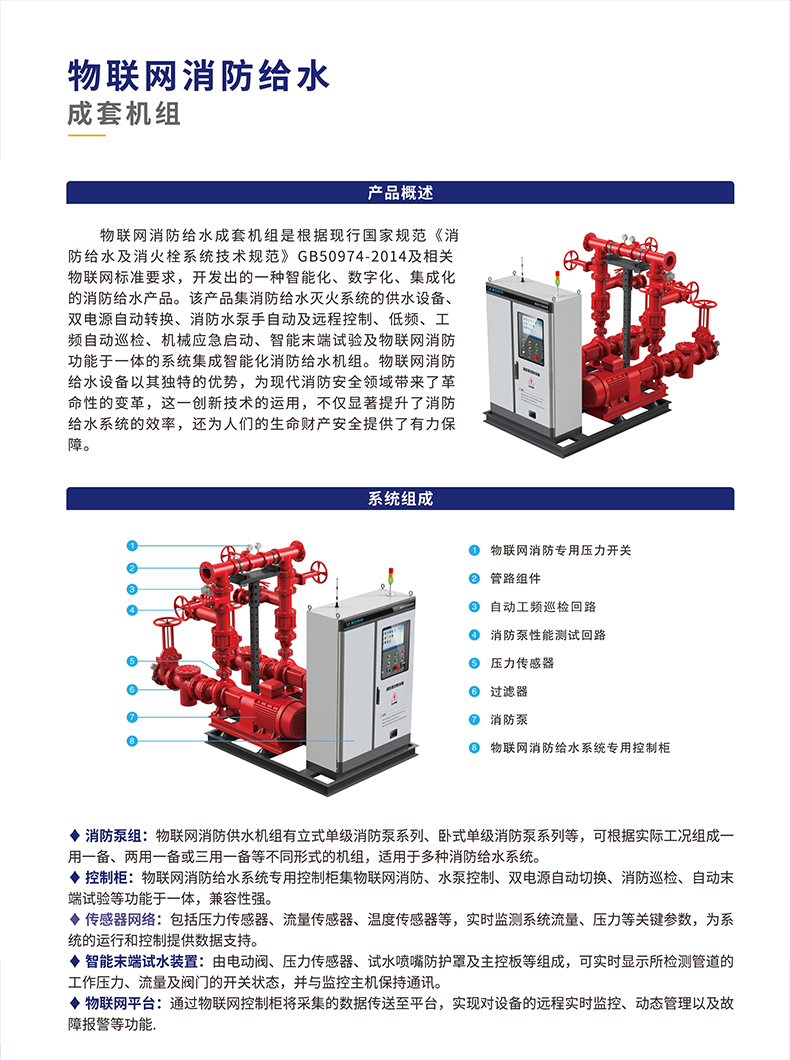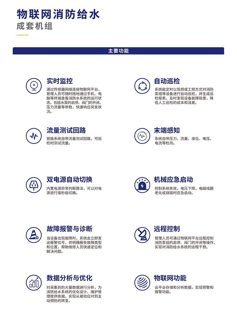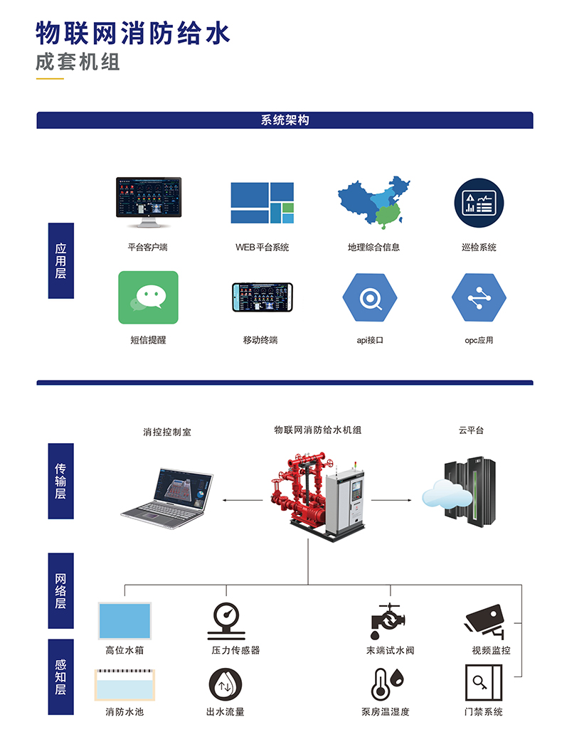 與之形成鮮明對比的是,物聯網消防給水機組借助先進的物聯網技術,實現了對系統的全方位實時監控。傳感器網絡如同密布的神經末梢,時刻感知著系統內的壓力、流量、溫度等關鍵參數,并通過物聯網平臺將這些數據實時傳輸給管理人員。無論身處何地,管理人員只需通過手機、電腦等終端設備,便能清晰掌握消防水系統的運行情況,真正做到了對系統狀態的了如指掌。