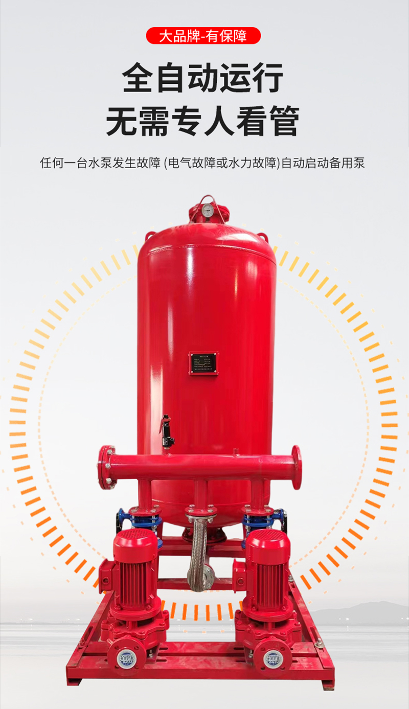在日常正常狀態下,消防穩壓成套設備處于一種動態平衡的工作模式。壓力傳感器持續監測水壓,控制器根據傳感器反饋的信息精準調控水泵的啟停,氣壓罐則適時發揮緩沖調節作用,確保消防管道內的水壓始終穩定在設定的合理區間內。一旦火災不幸發生,消防用水需求瞬間大增,管道內水壓急劇下降。壓力傳感器迅速捕捉到這一劇烈變化,并將信號快速傳遞給控制器。控制器即刻做出響應,一方面迅速加大對水泵的控制力度,促使水泵以最大負荷運轉,全力提供滿足滅火需求的高壓水流;另一方面,控制器還會協調其他相關消防設備,如開啟消防噴淋系統、消防栓等,確保整個消防系統能夠迅速且高效地投入滅火工作,為撲滅火災爭取寶貴時間,最大程度降低火災造成的損失。